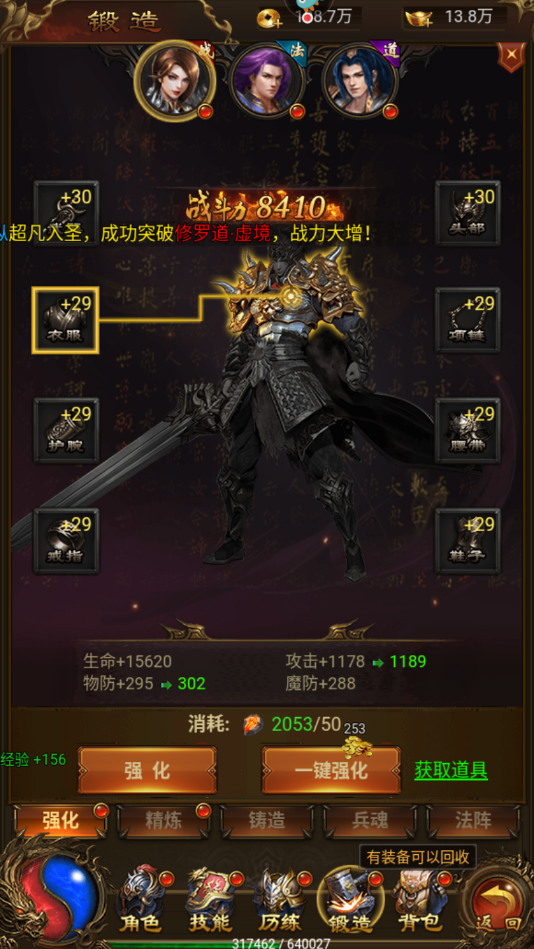 3、神装:神装其实也是装备的一部分,属于比较洗头的套装类型。神装提升的战斗力非常多,玩家通过刷副本来获得神装或者神装碎片。