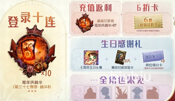 游戏里面不仅有着登录赠送的免费十连,还有着充值返利的福利。在活动期间进行充值的话将会最高获取到37的周年庆精华。咱们在活动期间还可以获得时装的6折打折卡,如果有中意的时装也可以进行获取。