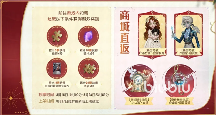 先看看时装的返场投票是哪两个皮肤,两套都是稀世时装,一套是“小女孩”-欧律狄刻,另一套则是作曲家-幽灵帆。第二种就是溯洄系列的返场服装,这个系列返场的时装就比较多了,高达九套。