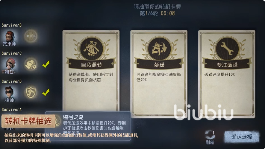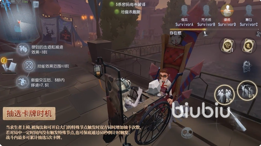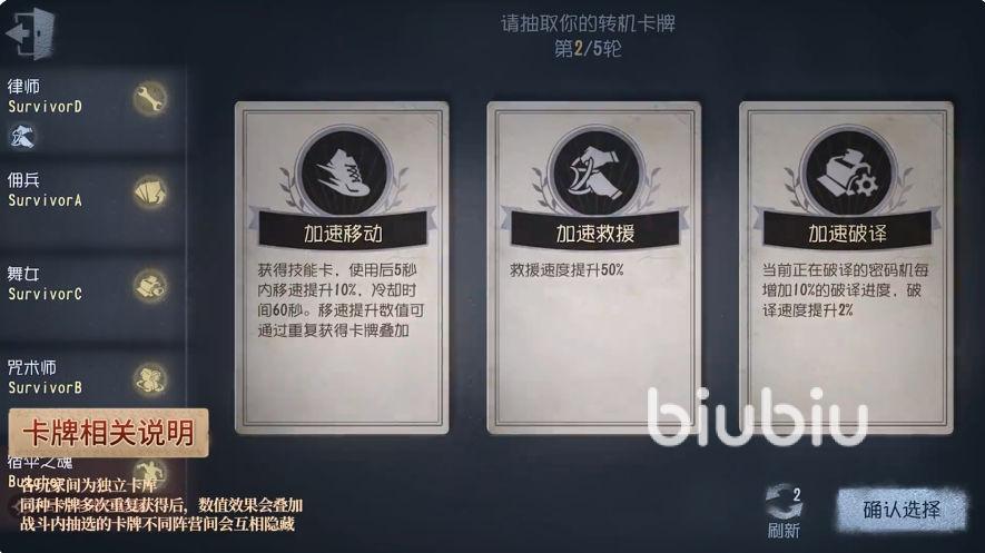 其次就是抽选的时间,转机卡牌进行抽选,是在多个特殊节点展开的,比如战斗之前的准备阶段,求生者被上椅子的时候,淘汰,或者大门打开的关键时刻,当然想要触发也是需要满足一些条件的;