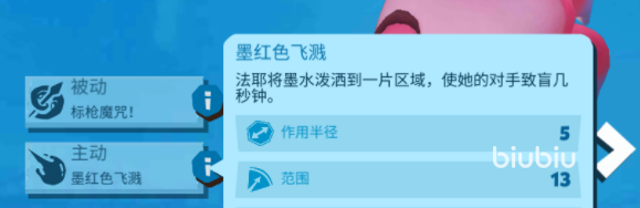 在看完它的基础属性之后,我们还需要了解一下它的两个技能才能更好的判断,两个技能都是攻击型技能,主动技能为墨红色飞溅,法耶将墨水泼洒到一定的区域,它的对手可以瞬间致盲几秒钟。使用半径为五米,范围为13,持续时间为五秒,在团队作战中可是非常有用处的,能为队友增加更多的输出空间,而且在无法确定攻击目标时,我们能占据整个战场非常强大的优势。