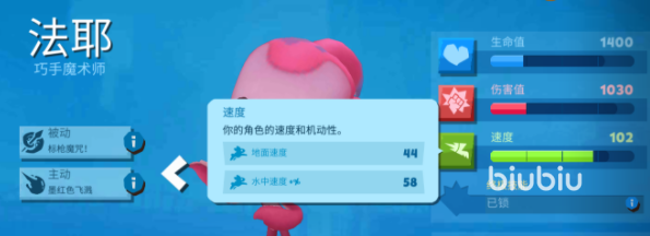 法耶虽然是一个小章鱼,但是它的外观更趋向于拟人化,被称为巧手的魔术师,主要以攻击伤害以及强大的防御力为主,我们可以看一看它的基础属性,在游戏内它的生命值高达1400,可以说这在所有的角色中绝对能名列前茅,而且1030的伤害也为其增加了更多的输出实力,它的速度是超级不错的,高于100的速度让其瞬间被很多玩家追捧,可以说,目前游戏内速度超过90的都没几个,更别说是100以上的了。