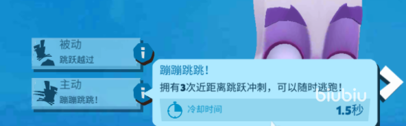它的主动技能为蹦蹦跳跳,这个技能可以连续使用三次,每次间隔1.5秒,在这期间我们可以进行近距离的超级跳跃,可以用于逃跑,属于一个逃跑神技了,但是作为一款大逃杀类游戏,这个技能用处并不是很大,一味地逃跑没有任何意义,跳跃越过也是一个逃跑的技能,可以跨越障碍物,快速进行跳跃。游戏内其实会有很多的障碍物,这个技能可以加快我们逃跑的速度。