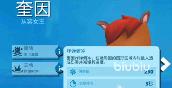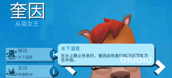 它的被动技能为水下温泉,可以在水下静止休息,快速恢复自身以及附近盟友的生命值,属于一个全面技能,可以帮助自己快速的恢复,在休息的过程中还能为队友带来一定的助力效果,在团队中是非常硬核的,团队奶妈,走到哪里都是很受欢迎的,而且战斗力还不错,完全可以自我发展。