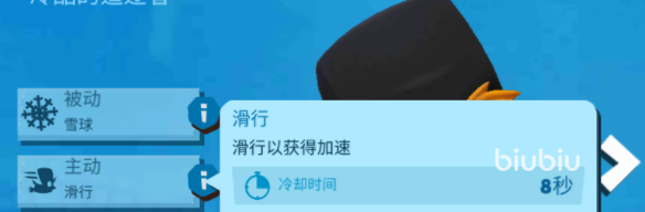 它一共拥有两个技能,我们可以具体来看一看它的技能以及使用技巧,它的主动技能为滑行,可以通过滑行来获取更多的速度加成,持续时间为八秒,额外的速度将提升5.4,这在实战中是非常有用的,基本上一段滑行结束之后,其他玩家是追不上自己的,可以帮助弥补一定的速度缺陷,而且在对战中拥有一定的逃跑能力,这个技能的CD时间很短,几秒钟都用不到我们就可以进行下次滑行了。