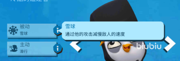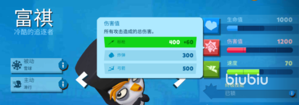 富祺的外观是一个萌萌的小企鹅,被称为冷酷的追逐者,它的生命值为1000,伤害值为1200,基础速度为70,这个面板可以说在众多水上生物中并不算突出,不过在陆地上的时候,它的速度也算是比较中规中矩的。它拥有三个武器,分别是聚焦射击、标枪,还有投掷。其中投掷和弓箭的用处比较大,可以在实战中拥有超强的进攻能力,为玩家带来很强大的输出效果。