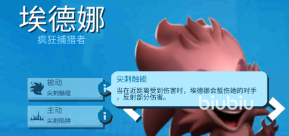 他的被动技能为尖刺触碰,当在近距离受到伤害时,埃德娜就会蛰伤他的对手,反射部分伤害,属于一个克制技能,如果自己被一个低血量的玩家追杀时,那么这个技能完全可以将其反噬,很有可能自己还没死,对面就已经先没了。