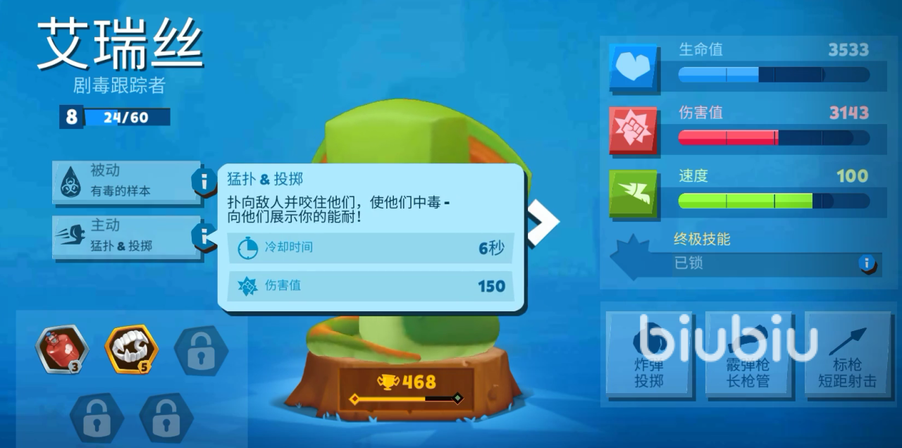 主动技能方面,该角色可以向指定范围内发起猛扑攻击,造成伤害的同时,并对敌方目标造成一段持续性中毒效果。被动技能方面,该角色后续所有的攻击武器都会附带中毒效果,只要该武器命中了敌方,那么敌方接下来都会有一段时间内会持续性的掉血。