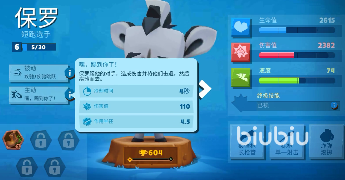 这名角色最大的优势在于其非常不错的陆地行动速度和短暂的可翻越能力,这使得他在陆地上其灵活性要远高于其他动物角色们。并且本身拾取的武器方面火力也较为不错,在对敌过程中也可以做到放风筝,边打边撤等一系列目的。