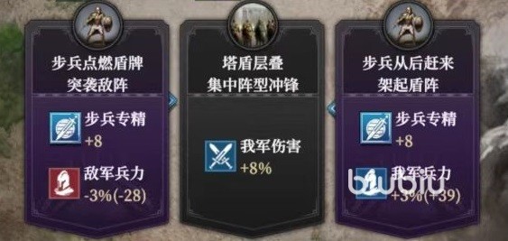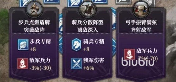 专精是军团战的重要策略之一,兵种的专精越高,该兵种获得的加成也就越高。专精达到5级和7级时,还可发动强力的专精技能。在战斗中,我方和敌方的专精会相互抵消,专精更高的一方,将按照最终的数值获得对应加成。骑兵、步兵和远程三个兵种之间,存在克制关系,一定要灵活运用克制关系,来获得更大的优势。战斗中之后敌我双方都会获得同样的初始士气值,士气越高士兵造成的伤害越高,士兵数量减少时,士气也会随之降低。如果某兵种被全歼,那么会大幅度降低士气。