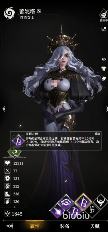 她是强大的法术爆发角色,在场时能一人打出两份伤害,并且还能不断让输出越来越高,她的被动“灵语之碑”会在开场的时候召唤一个石碑,石碑会每6秒对单体敌人造成100%魔法伤害,敌人在阵亡时能让自己获得一层汲取,汲取会提升自身5%伤害,最多可提升60%,她的普攻会对目标造成962点法伤,她的能量技会召唤出愤怒的荒魂,对目标及相邻的敌人造成法伤。