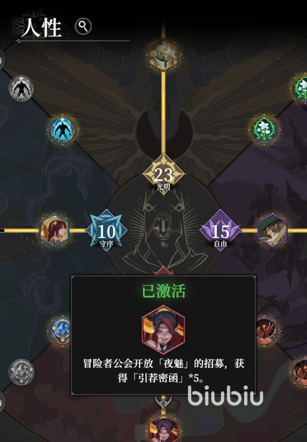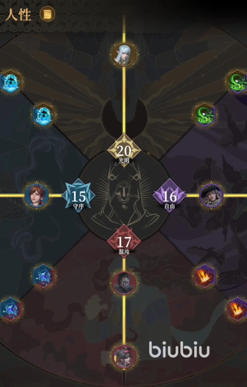 若大家想扮演恪守原则、庇护弱小、追求正义的角色,可多选光明和守序的人性属性;若想扮演无拘无束、追求自我、探索未知的角色,可多选自由属性;若想扮演利己主义、不择手段、欣赏混沌的角色,可多选混沌属性。