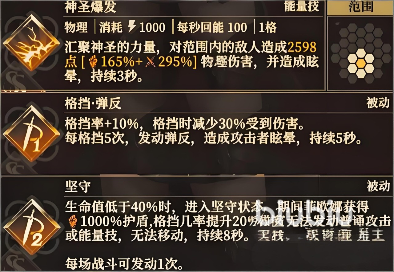 菲欧娜是秩序阵营护卫,职业为初光之盾,核心机制为圣盾壁垒,天赋树分为生存强化和控制延伸以及团队辅助三大分支,需要根据阵营需求灵活的进行分配。关于它的核心机制分为了三种,第一个格挡弹反,普攻有20%概率触发弹反,造成眩晕并反弹伤害,是打断敌方技能的关键手段;第二个坚守被动,血量低于40%时,触发获得一千百分比护盾值和20%格挡率加成,持续八秒;第三个群体控制是能量技能,可对于范围内的敌人造成物理伤害与眩晕,配合弹反形成控制链。