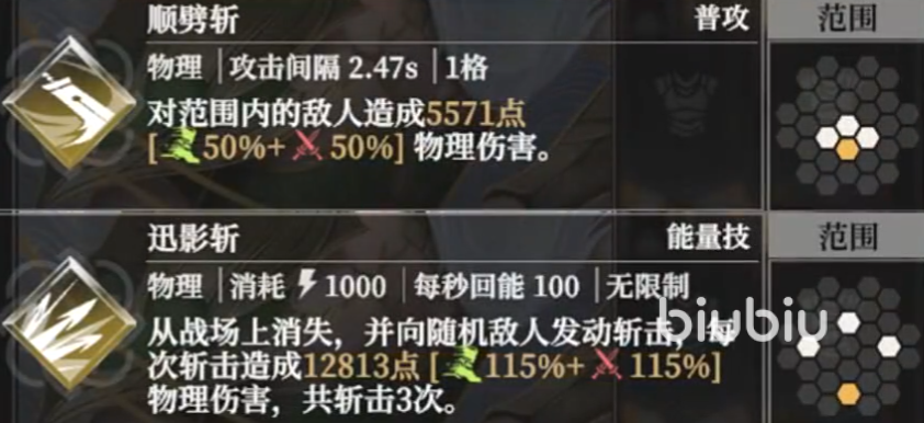 能量技为“迅影斩”,消耗1000能量,冷却10S。战场上消失后向随机敌人发动三次斩击。每一次斩击造成的伤害是115%的敏捷+115%的攻击力物理伤害。因为是从隐身或者隐形状态发起攻击,这就给她带来很强的突袭能力,甚至能规避掉一些伤害。