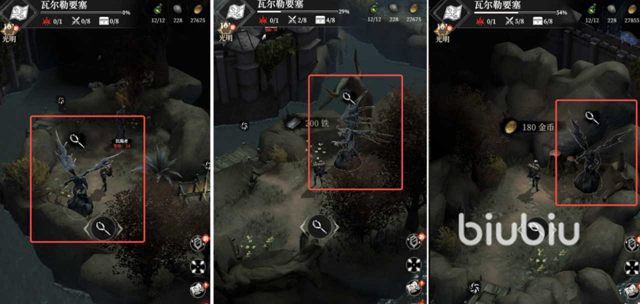 地图资源方面,在上岸后需要摧毁两座塔楼,奖励物资。继续探索时,如果前往城区右下方并击败兜帽修士,还能获得藏品“深渊之镜”。左侧的城堡区域则有多段挑战,首先需要选择击退杂兵或投掷粗制火药炸开大门,成功进入后即可营救工匠,直接工匠+2。