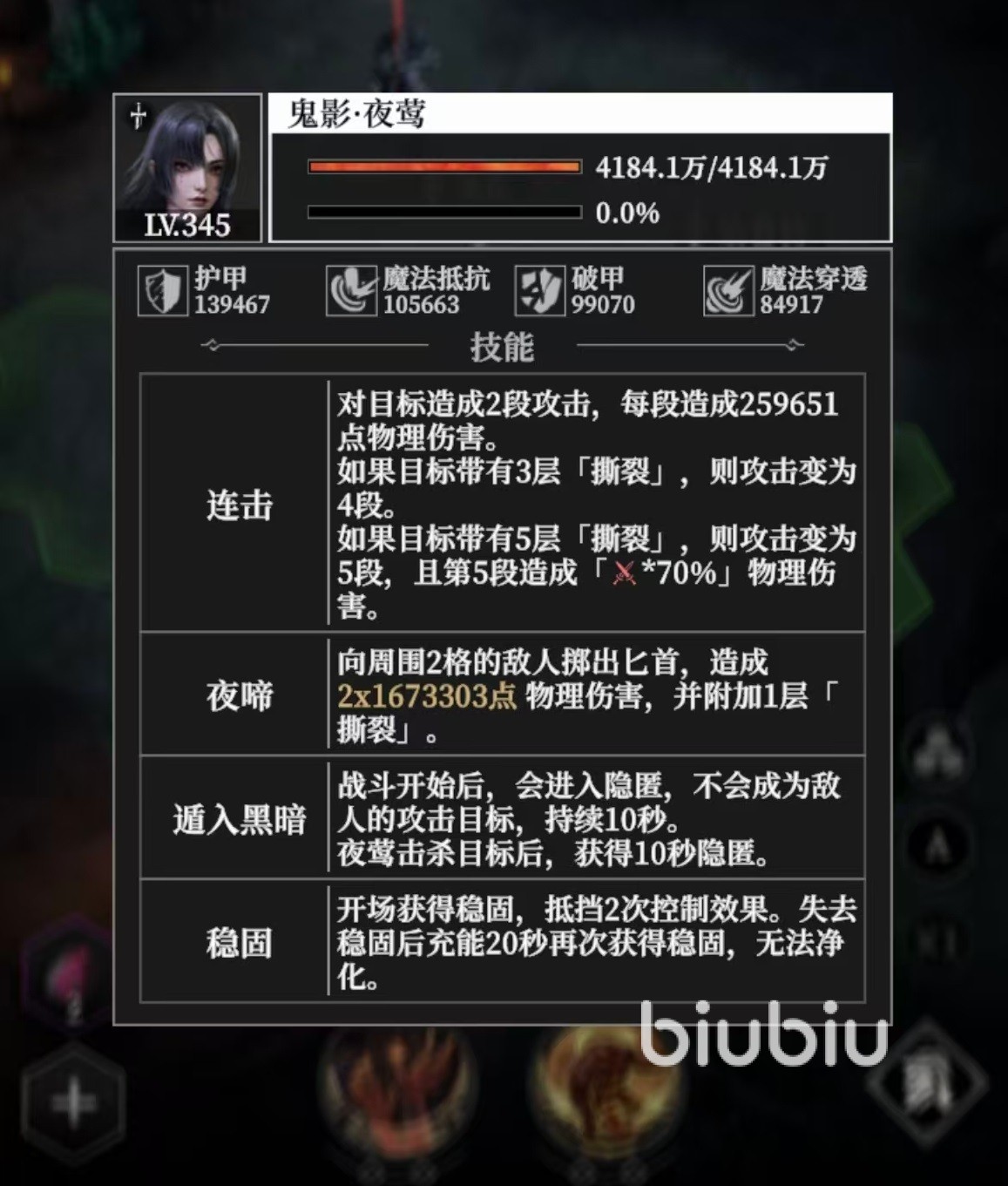 夜莺是游戏中第16章的boss,属于比较常规的类型,打法相对简单。它具有的连击可以对目标造成两段攻击伤害,如果目标身上带有撕裂,则攻击变为多段,撕裂的层数越高,打出的伤害就越高。还有技能遁入黑暗,战斗开始后会直接进入隐匿状态,不会成为敌人的攻击目标。在夜莺击杀目标后会获得持续隐匿,开场就能获得稳固抵挡控制效果。搞清楚技能之后,阵容搭配其实比较简单。