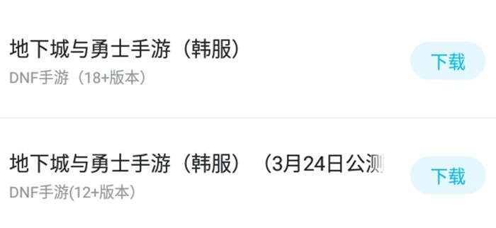 4.可以看到18+版本、12+版本以及大陆服版本,推荐大家点击12+版本右侧的下载进行游戏客户端的下载,并且点击大陆服右侧的预约,在DNF手游国服上线的第一时间我们会推送给大家;