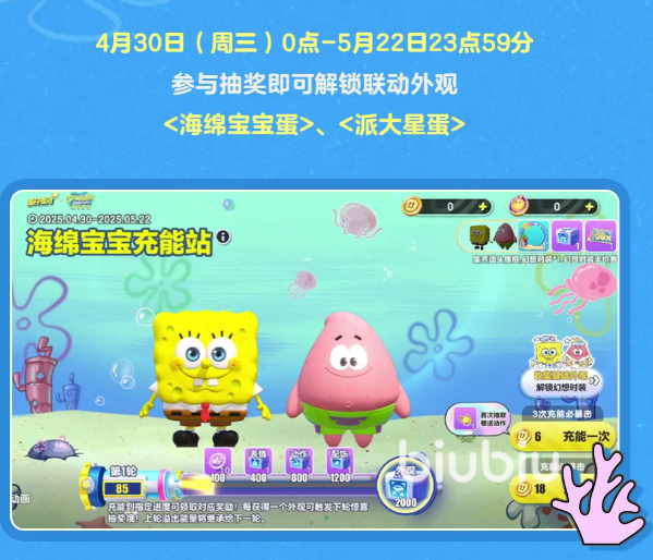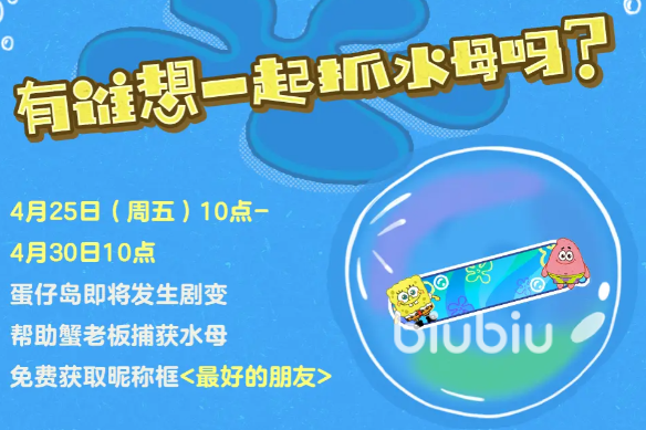 在游戏之中咱们需要帮助蟹老板来捕捉水母,在捕捉到一定数量之后玩家们便可以获取到免费的昵称框,最好的朋友。同时在联动开启后咱们可以参加海绵宝宝充能站来进行抽奖,抽中之后可以解锁联动的外观海绵宝宝蛋和派大星蛋。