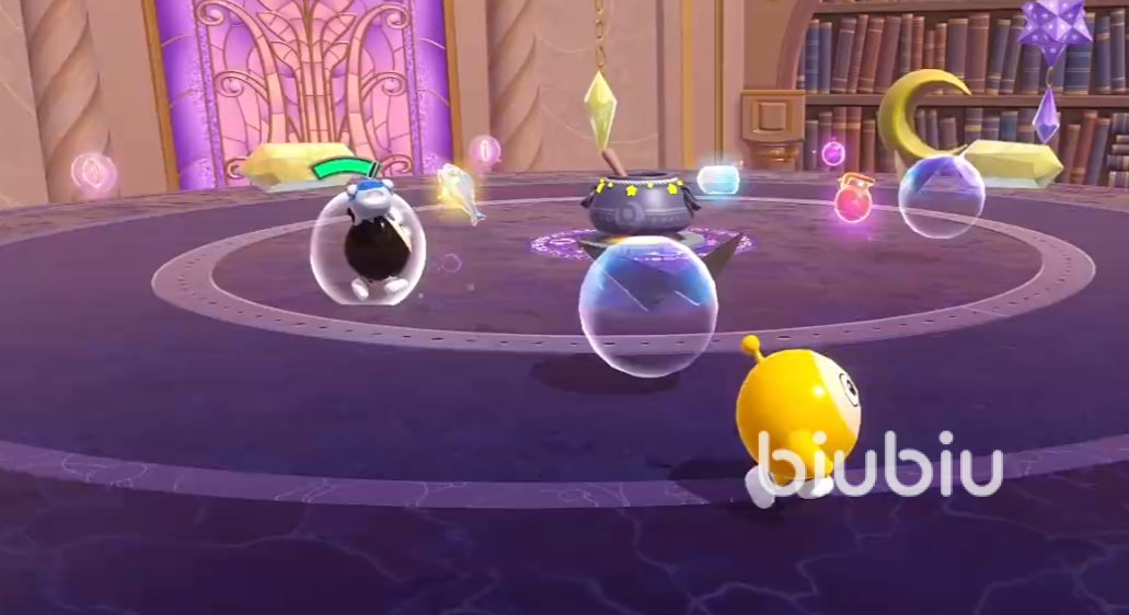 大家需要找准时机,在陀螺面前起跳,这样能帮助跳得更高,率先到达终点的玩家将会晋级,“魔法的坩埚”地图中间包含的坩埚会不断向着周围发射魔法子弹,子弹落地会随机生成追着大家跑的机关,玩家需要运用灵巧的走位来及时逃脱,不然的话就会连续遭遇到袭击,影响到最后的胜负。