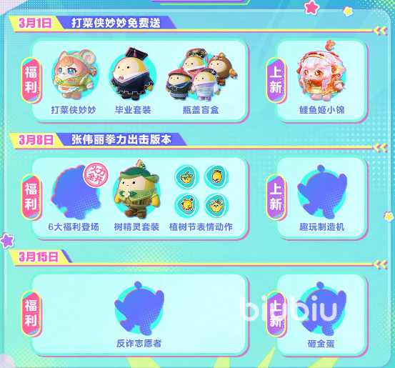 首先在3月1号的时候就有免费的套装赠送,此外还会上新鲤鱼姬外观,3月15还会有神秘的砸金蛋活动,也是有皮肤的哦。8号到21号之间,会开启你好精灵的活动,在这个期间,大家只要完成活动任务就可以兑换浇水壶的奖励,还可以免费得到树精灵套装,持续时间很长,所以小伙伴们哪怕中途忘记了也是来得及去做任务兑换的。