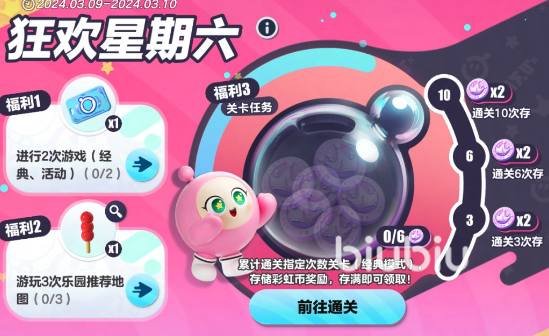 在3月9号到10号的时候,大家参与狂欢星期六可以得到配饰糖葫芦,此外还有6个彩虹币的奖励以及一张巅峰排队保护卡的奖励,只需要每天游览三次乐园推荐的地图以及参加两次经典活动就可以得到了。
