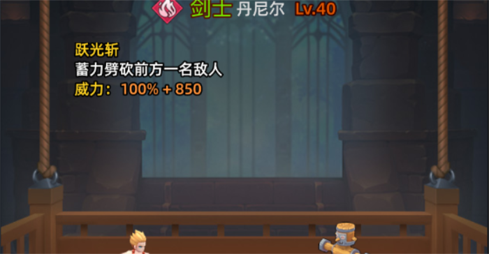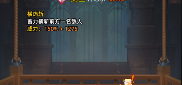 第二个技能是横焰斩,可以蓄力横砍前方的一名敌人,可以针对单一敌人进行攻击,再搭配群体攻击的角色,就可以快速打败敌人,结束战斗,这个技能的威力是百分之一百五十加上一千二百七十五的伤害,虽然两个技能和高阶职业的技能比起来,并不是很高,但是前期用一段时间问题不大。