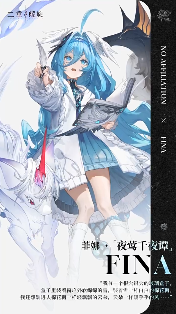 菲娜是五星角色,拥有深蓝色长发,蓝色眼睛,天使的配饰,是个具备纯洁和神秘气质的角色。战斗时,通过使用巨剑,弓箭的切换,自如攻击,善于使用冰属性相关能力,也能召唤精灵协同战斗,并给队伍提供增益。近战时能造成高额伤害,远程攻击时也是支持移动射击,能快速瞄准对手攻击。还能根据不同效果,自如切换领域,不同领域带来不同影响。