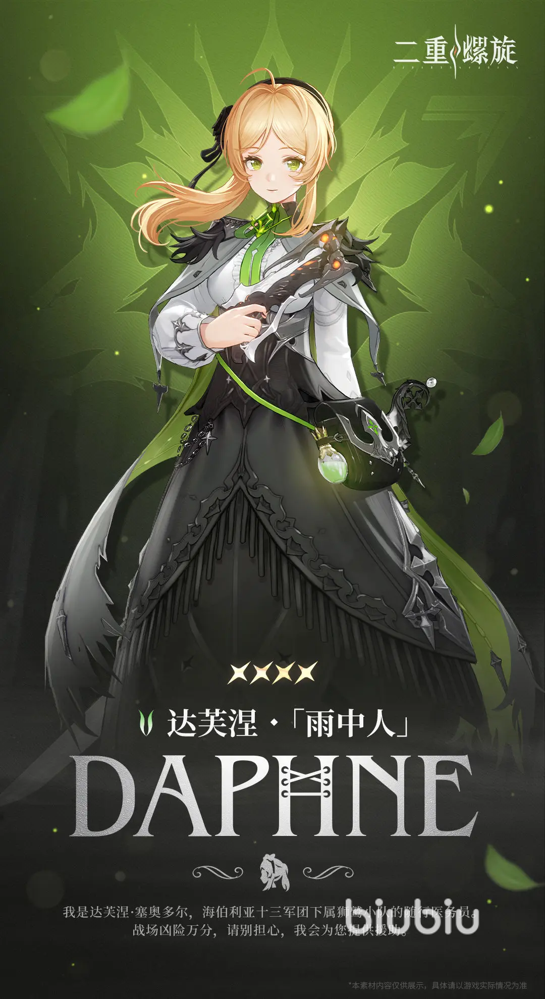 “雨中人”达芙涅是个四星角色,外形设计清纯可人,是风属性角色,专精武器有鞭刃和突击枪。被动技1,持有“阿佐特弹”时,她远距离武器的触发概率提高,持有数量存在上限,每次远程武器射击时,需要消耗1发。被动技2“银泪销蚀”,同样是持有期间,远程武器造成伤害时,额外结算一次目标的“腐蚀配方”持续伤害,结算倍率根据该武器触发概率来的。被动3“奋激”,这个只能在作为协战队友是生效,自身和附近队友暴击提高。