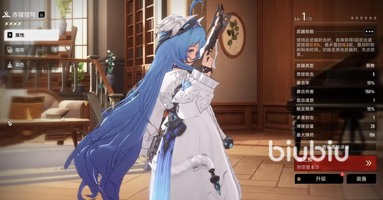 赤猩猎弩是一把四星武器,虽然在稀有度上比不上蓝色脉动,但它有着完全不同的特点与优势。在基础数值上,赤猩猎弩的攻击同样为5,暴击率为15%,暴击伤害150%,整体面板略低。它的弹匣容量与最大弹药同样是20与150,触发概率则为15%。