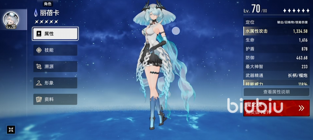 该角色相信会有很多朋友喜爱,她的外观是个蓝色水母头,水属性角色,品质也比较高,为SSR。长柄就是她惯用作战武器,是生存能力很强的辅助,虽然攻击力低,但是生存数值超高,T0的生存位。招式1召唤水母,拥有她100%属性,最多能有3个水母存在,并对敌人打出持续范围损伤,且被动可叠加对敌方添加的毒buff,每2秒就对敌人进攻,上限叠6层;绝技给敌方挂buff,提高水属性伤害,此时叠加层数越多,对手承受伤害就越多,时机合适甚至能斩杀对手。