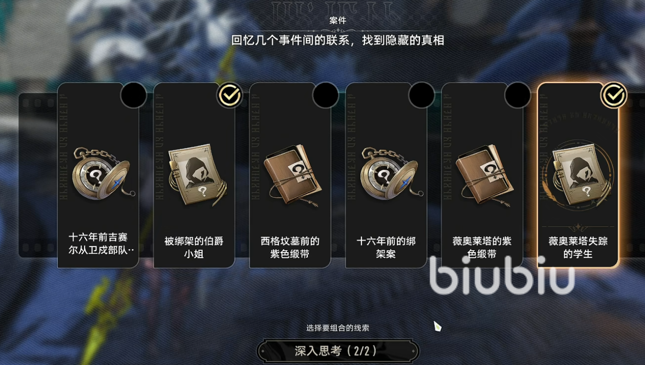 继续跟着任务指引传送到休憩之所附近找到费恩和他的老师,对话之后按“V”推理,选择深入思考“被绑架的伯爵小姐”和“薇奥莱塔失踪的学生”。然后是两个紫色缎带,最后再思考2个十六年前的线索,得知吉赛尔因十六年前的绑架案而离职。