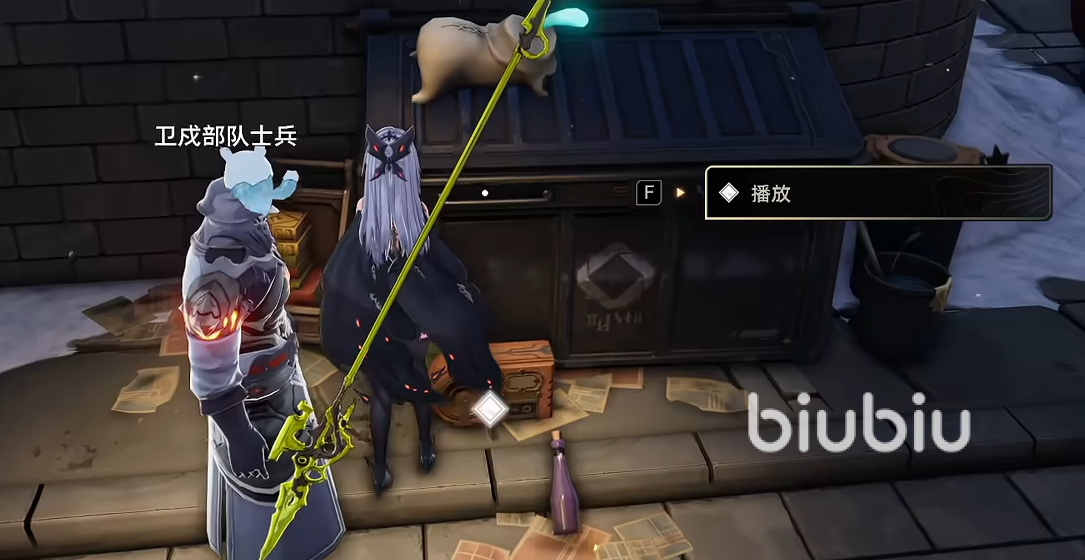 传送过来后向着地图东边方向走,跳下,会触发剧情,来到一处垃圾箱附近,与卫戍部队士兵对话,然后可以看到垃圾箱旁边有一个可以互动播放的录音机。