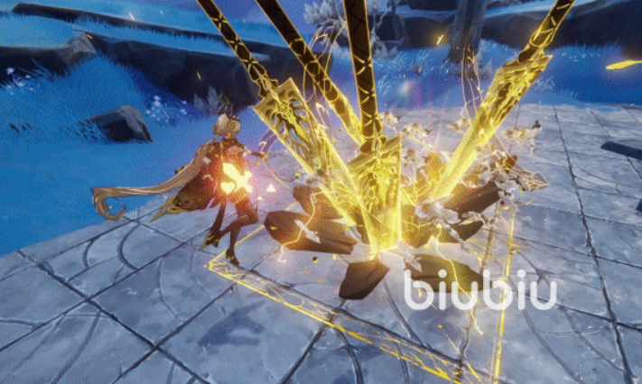 她的“解天机”在点按的时候,会对面前范围内敌人造成雷属性伤害,并让自己得到一枚“泉符震”,长按的时候会对周围范围造成雷伤,并给自己附加护盾,自身获得一枚“泉符巽”。