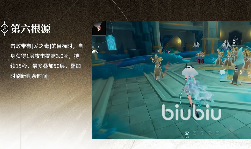 第一根源触发额外效果时额外附加1层爱之毒,这是提高伤害的关键因素,因为爱之毒叠加后能显著提升该角色的爆发能力,叠加得越快,战斗中消耗的时间就会缩短,尤其在应对密集小怪时能快速建立输出优势。