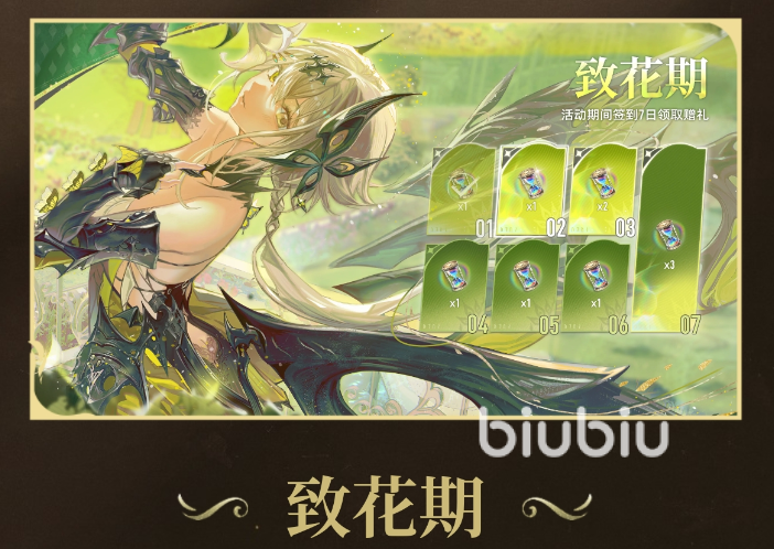 第三个活动是在丰饶赞美诗活动下,登陆游戏期间大家可以累计获取10个白色沙漏,领取没有任何的要求只要大家参与活动就能领取,第四个活动致花期活动期间签到7天就能领取赠礼,总计是十个沙漏,也是非常良心的奖励内容。