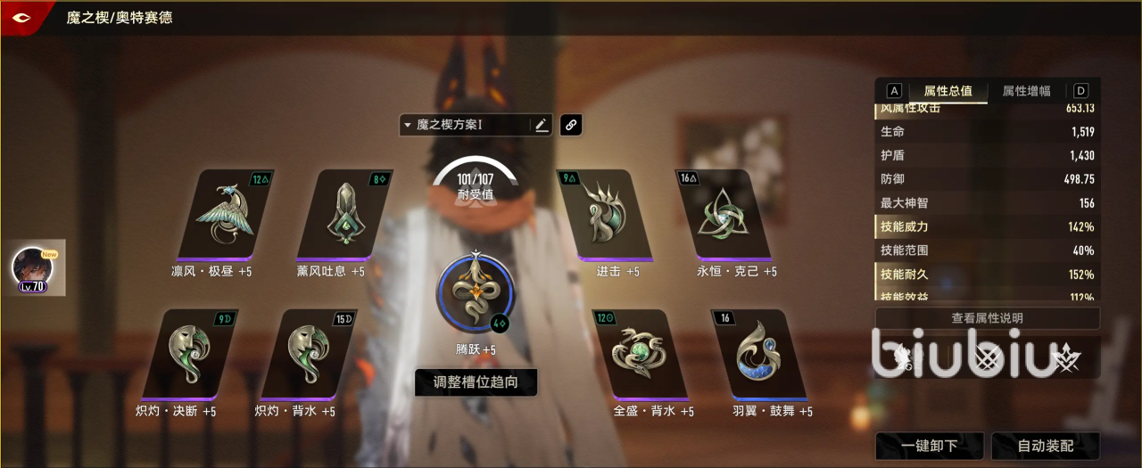 魔之楔搭配要紧扣奥特赛德爆发和破甲的核心。如下图,可以选”凛风·极昼“、”萧风吐息“、”永恒·克己“、”全盛·背水“、”炽灼·决断“,这些都很适配角色的技能。不过在在资源有限时,大家可以优先拉满核心魔之楔的技能威力属性,后续再补耐久性这些,这样既能保证秒伤,又有一定生存容错。