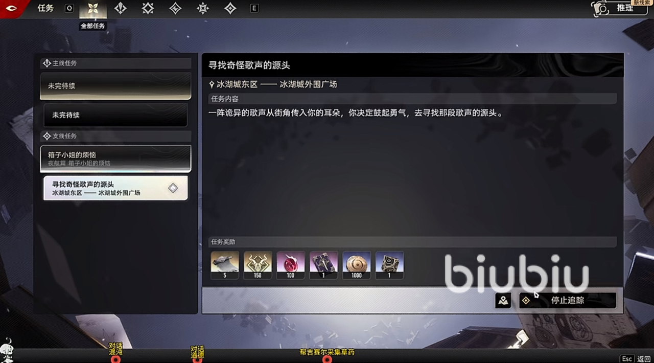 箱子小姐的烦恼是二重螺旋游戏中的一个支线任务,玩家们来到游戏中的冰湖城这一地图时,将会在冰湖城东区的外围广场听到一阵诡异的歌声,这时任务将自动接取。点击追踪任务后大家可以传送到修普诺斯之家传送点,到达传送点后往南方向也就是玩家们身后一直走,大概移动一二百米就可以到达任务指引地点。这时需要小巷黑暗处往下跳,不然无法触发过场动画。