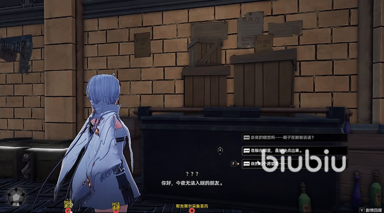 顺利跳下去后会自动进入剧情对话,出剧情后大家可以和面前的箱子发起对话,这时将出现【是我的错觉吗……】、【谁躲在那里……】以及【你的三个愿望是】三个选项,选择不同的选项会看到不同的对话,但推荐玩家们选择第三个,这样能更快完成任务。