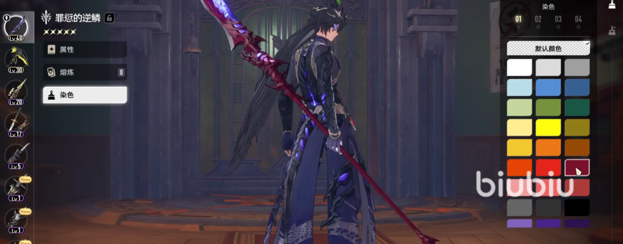 点击后可以在左侧查看自己已经拥有的近战武器,想要提升武器造成的伤害和固有属性,可以通过使用同武器升阶来完成熔炼。另外还有武器染色功能,进入后在右侧能看到可选取的染色区域以及欲染颜色,这也让玩家们的武器有了更多可自由DIY的空间。