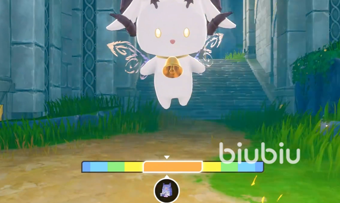 不断喂养可以看到它下方的光标在慢慢移动,等光标移动到中间的橙色区域就可以捕捉了,给予越高级的罐罐,捕捉的成功率会越高,不过高级的只能在商店购买,普通的罐罐不限量使用,但是成功率会比较低。