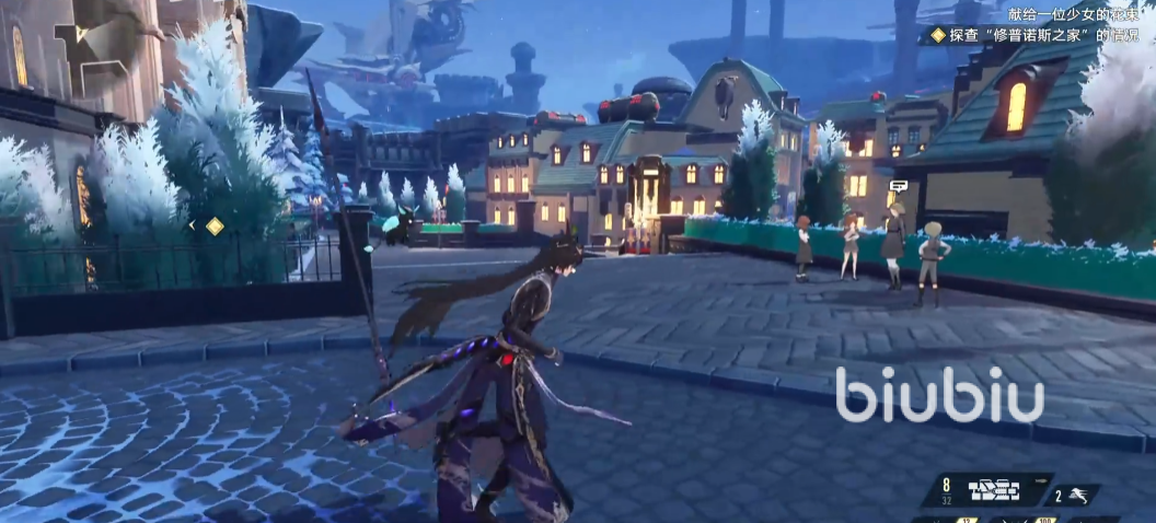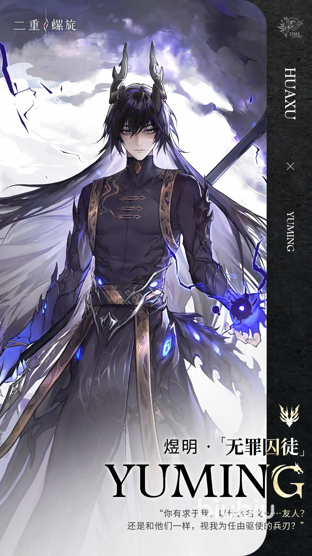 第一个男角色叫煜明,是五星的雷属性英雄,精通长柄武器,头上长有龙角,技能机制也围绕着“蛟龙”展开的。1技能使用后,对他四周的敌方目标打出雷属性伤害,同时自己会跳跃到空中,滞空后下次下落攻击范围变大;如若在”玄蚊附身”状态下,下次下落攻击对敌人额外造成一次雷伤。