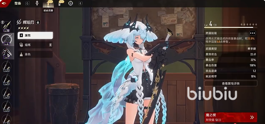 每个武器都是有品质的区分的,被区分为蓝,紫,金三种,品质越高,一般来说武器自带的属性就会越好,紫色品质以上就有各自特殊的效果,例如辉珀刃,它有自带的武器技能,在角色打出暴击伤害时,有25%的几率回复5点神智。