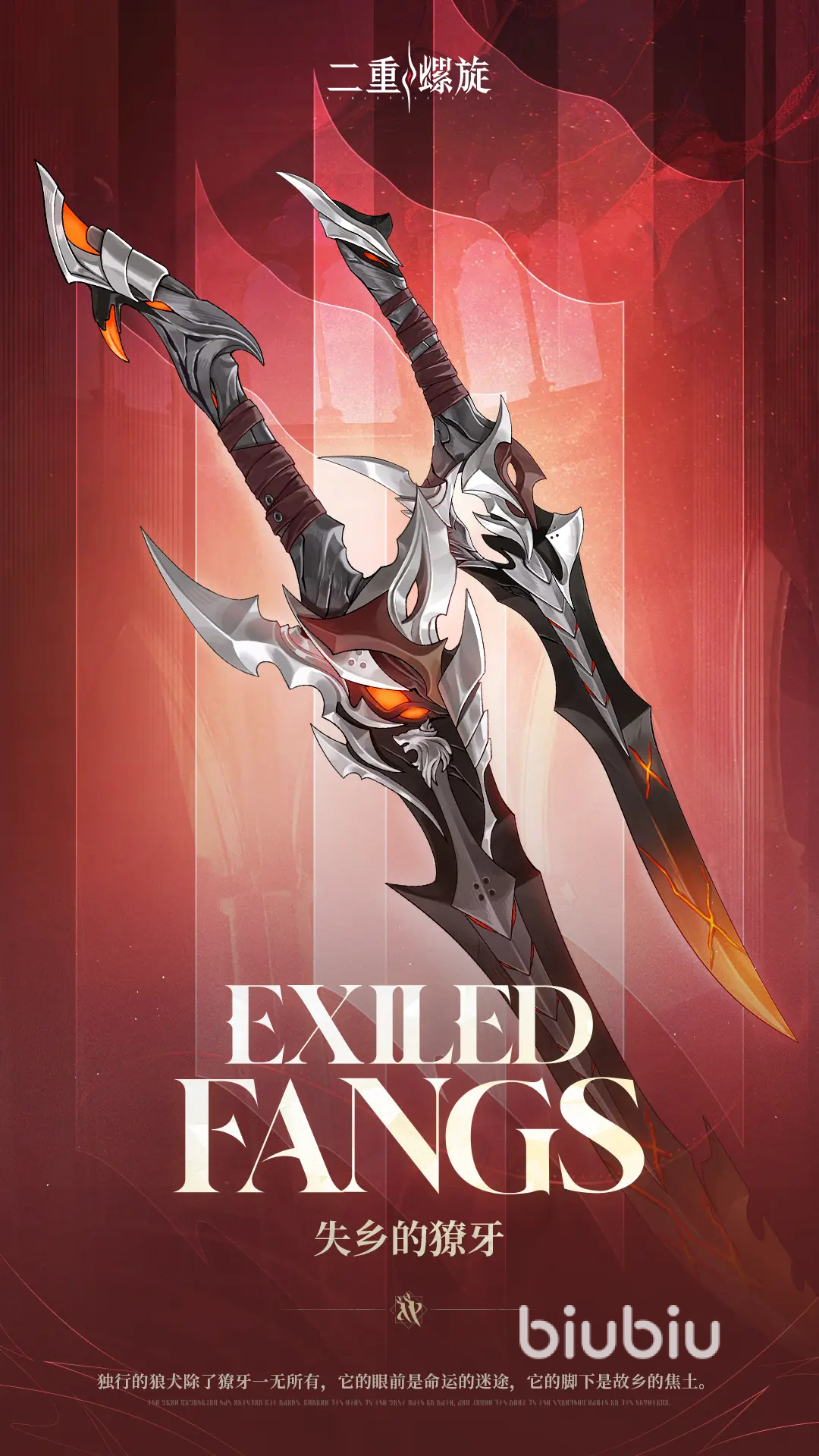 其实目前来说官方所推出的双刀武器只有一把,他的名字叫做失乡的獠牙,并且同样是五星级别的稀有度。从武器描述上来看的话,这是一把独行的狼犬,因为他只有一对锋利的獠牙,除此之外就别无其他。他的眼前只有未知的命运,并且踏着故乡的焦土勇敢前行。