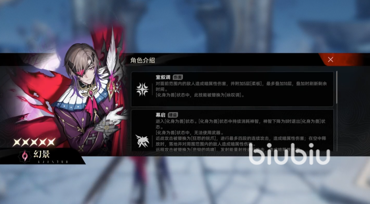 幻景的核心输出结构围绕柔板-沉浸度-爆发三个环节展开,并且有着两种形态。当他处于人形状态时,最可使用主动技“宣叙调”对敌方叠加[柔板](最多10层),柔板本身不造成伤害,但会在兽形态下转化为增伤依据,并触发爆发技能[休止符]。