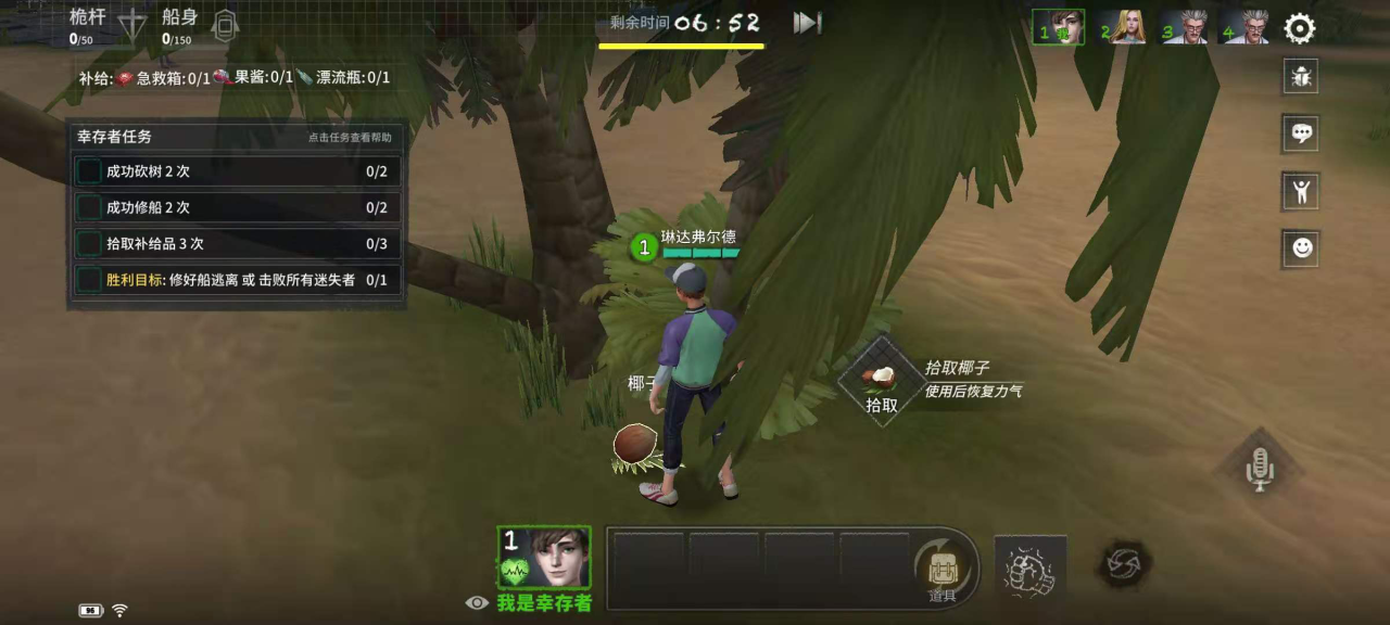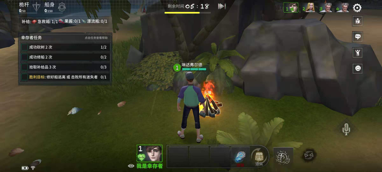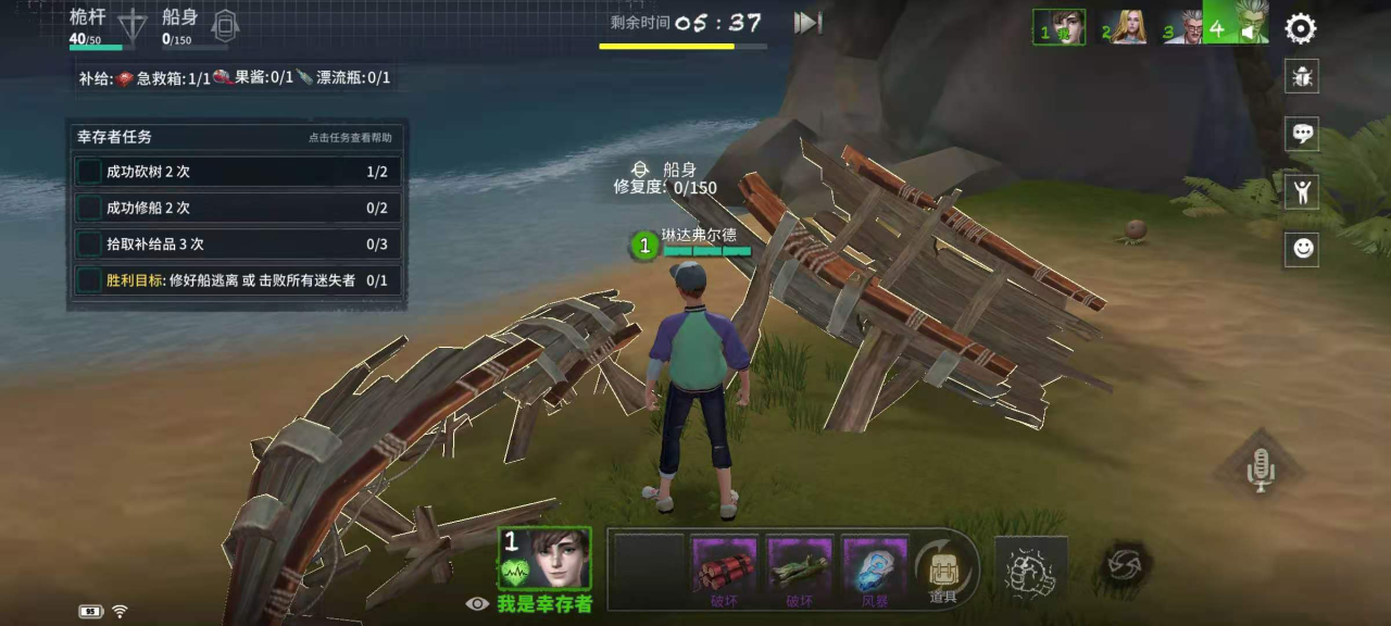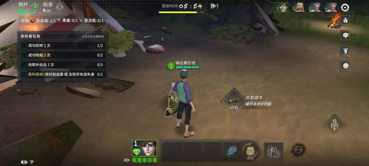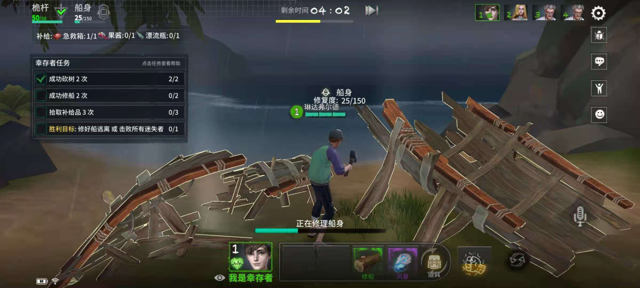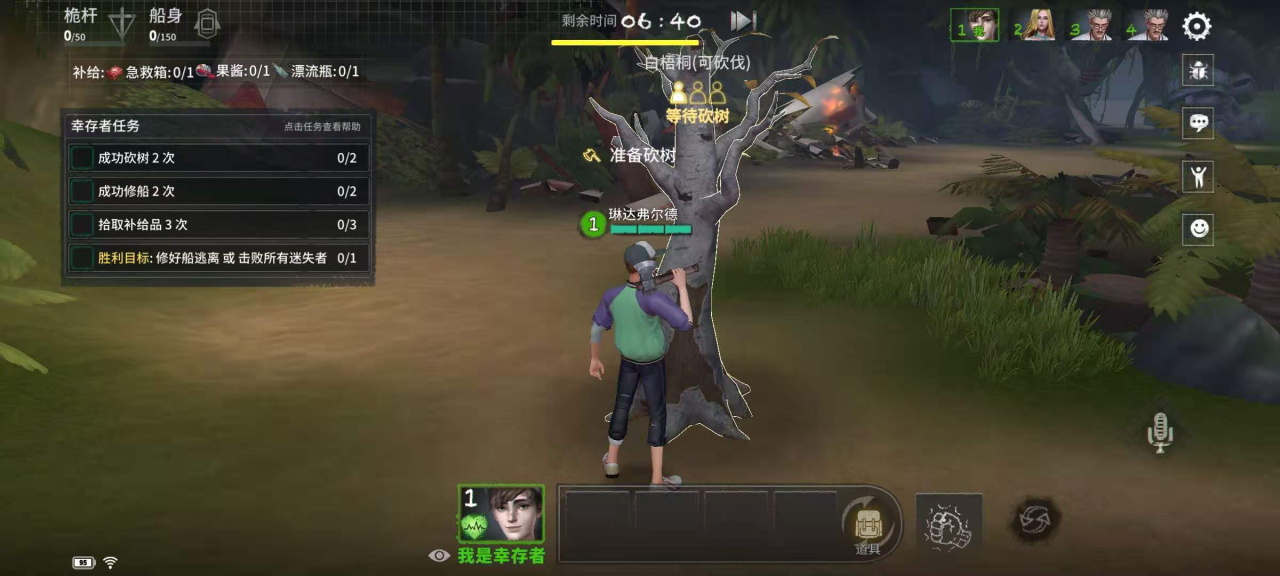 先来说一下幸存者使用的道具,木材需要砍树得到,三个人合力可以砍倒一棵树,随后新顾幸存者需要捡起木材,来到破损的桅杆或是船身处,点击使用道具栏中的木材就可以了,作用是时船身或是桅杆的维修进度增加10点。