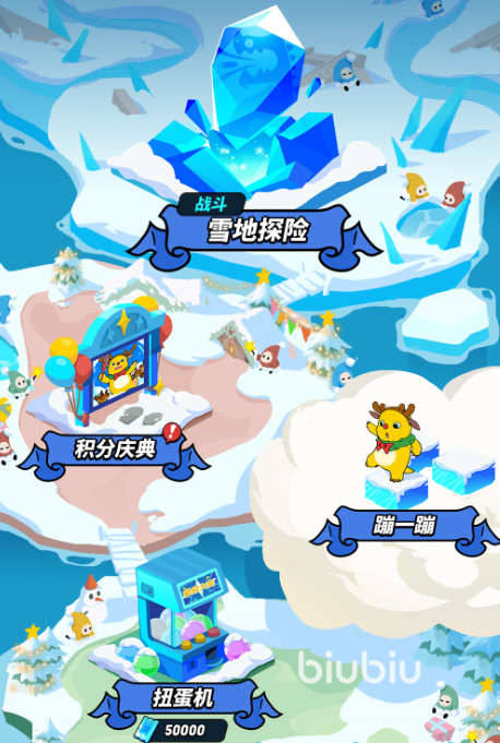 之后大家会看到一个叫做乐游冰雪嘉年华的活动,该活动中有多个玩法,这些玩法分别是雪地探险、积分庆典、蹦一蹦和扭蛋机,在这几个中雪地探险为战斗玩法,该玩法中玩家可以获得积分,在拿到积分之后就可以前往庆典玩法中兑换奖励。