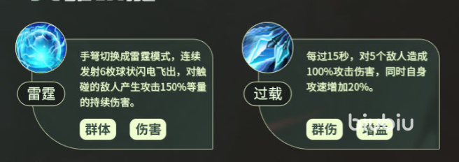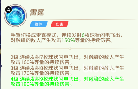 只不过她与普通射手一样,血量比较低,所以很容易就会被敌方击败。而其群攻型技能是将手中的弩箭切换成了雷电模式,会持续向前方发射几枚圆形的闪电,在它碰到敌人的时候会对其产生百分之一百五的等伤。