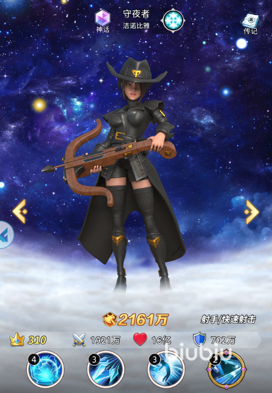 通过其外貌就可以看出这个是一名使用弩箭的射手,她全身的装扮都是以黑色为主,配上其脸上的表情,可感觉到她是非常不好惹的。在属性上,这个角色有着非常高的攻击伤害,几乎与输出类型的英雄相持平。
