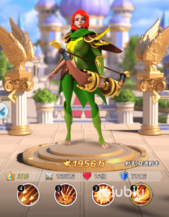 此角色的本名叫做阿塔兰忒,其外貌是有一头火红头发的女子,身上的服饰确实以绿色为主。手上拿着一个很大的弓箭。通过技能介绍可以知道的是,这个角色的群攻型技能,是对着场中释放三次箭雨,在这个区域中的敌人会受到高额的伤害。
