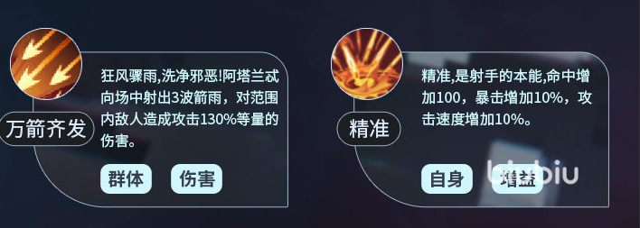 还有一个技能被称作为射手的本能,在击中对方以后会伤害的加成,期中暴击和攻速都会加百分之十的属性值。从这些技能中可以看出,这个角色的伤害是很高的,虽然属性没有达到顶尖的水准,但其输出的频率和技能的伤害加成都是不错的。